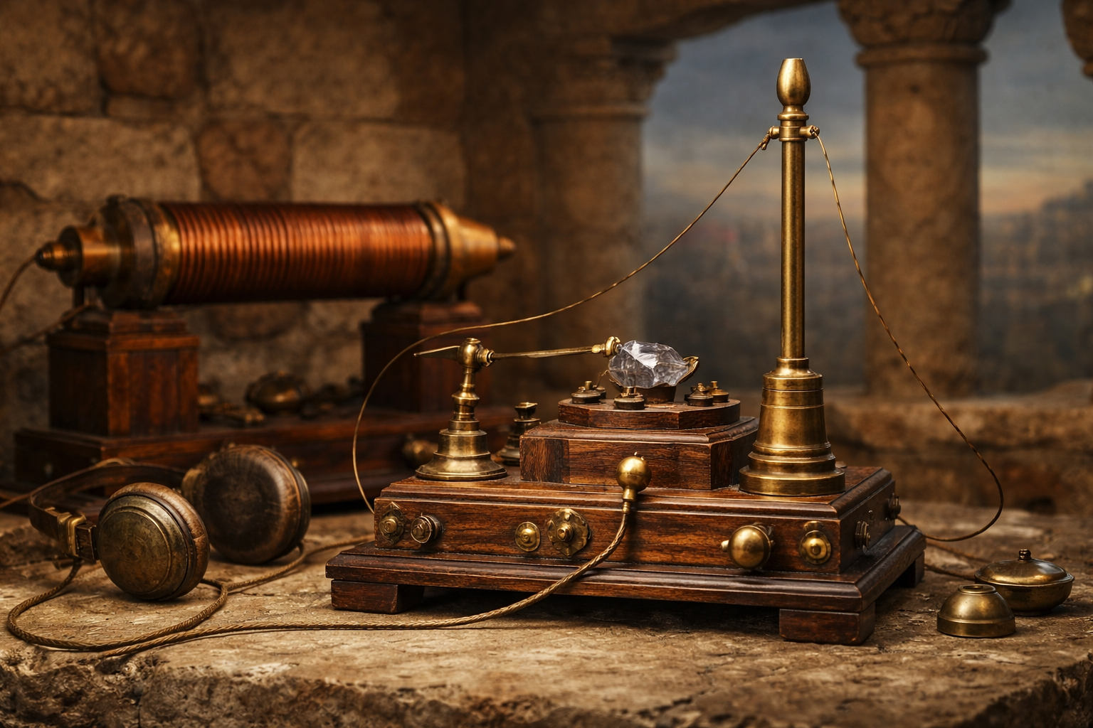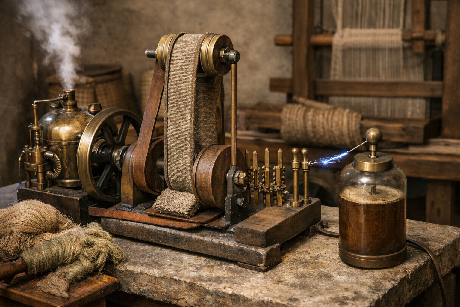 What would you introduce? Personally, I would build a spark gap transmitter. That was possible with Roman tech. The first pic is the transmitter. Steam engine (left)>Brass boiler with pipes, valves, and a flywheel >Generates mechanical rotational energy from steam >Drives the belt system via a crank Belt-driven generator (center)>Large vertical rollers/drums with a rough hemp or linen belt running over them >Belt friction against the rollers or pads generates static electricity (triboelectric effect) >The bottom drum is connected mechanically to the steam engine flywheel >Tensioning rod/axle keeps belt tight Metal combs / contacts>Positioned near the moving belt (small brass posts) >Collect static charge from the belt without touching it >Feed charge to the Leyden jar Leyden jar (right)>Glass jar with a metal cap and rod >Stores the high-voltage static charge >Connected to a spark gap (two small posts where you see the blue arc) Spark gap>Two brass posts next to the Leyden jar >Where the arc jumps when voltage is high enough >Arc is directed toward a metal antenna rod (or just floating if for demonstration) Antenna / terminal>Metal rod sticking out from spark gap >Radiates electromagnetic waves during the spark >Bundles of raw hemp or linen fibers >Used to make the belt and also likely for weaving/looms >Shows the dual-purpose of Roman tech: textile + electricity Receiver in the second pic. Uses Galena crystal and lodestone headphones.