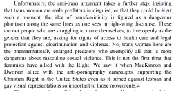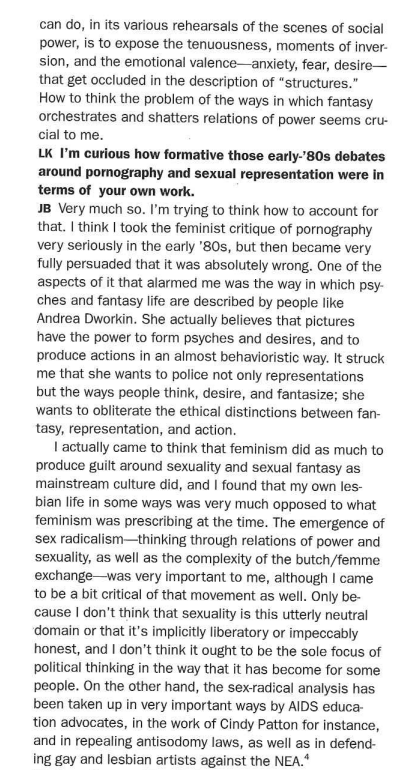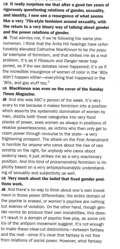 Is there a Dworkin discourse going on on twitter, I just saw a thread about her there. I am going to copy it here as I think it is an actually intelligent critique as opposed to misogynist screeching about how she wasnt fuckable enough ITT. >There is something to be said about the fact that the lost granddaughters of radical feminism obsess over Dworkin's bibliography but rarely engage with the works of the actual founders of the movement. Excerpt above is from Ellen Willis, one of the Redstockings co-founders. To be fair, the whole 1984 essay is an evaluation of the misteps of radical feminism, from its theoretical affiliations, politics and unfolding during the 70s. Here is Butler, 1992, on MacKinnon and Dworkin: [see picrel] >Butler, on 2024 (Who's Afraid of Gender?), stresses that while MacKinnon is and Andrea was transinclusive thinkers, highlights that even though there is distortion in the GC adoption of their work, the pratical political affiliaitons with the right were premeditated by them. Even though you do find transinclusivity in the Dworkin's wonder, one wonders why she wrote a blurb for Janice Raymond's The Transsexual Empire, which remains the firm theoretical ground for Gender Critical rhetoric. Or better yet: why she didn't criticize it? I know that Andrea's writing can be captivating. It is powerful, a ruthless description of male violence and domination, and I will contend that some aspects of her work can shed light on this. I still think that Right Wing Women is her better work, though, and very useful to expose the logic behind the driving force of the Gender Critical and TERF movements today. Yet, it is entirely dishonest to only look at her writings, to not think on the effects of her political activity and stance. It is not distortion all the way down. While her writing can be great at exposing misoginy, I don't think her work can be separated from a strong polarized sex metaphysics, that, as Willis pointed out, reify the sex-class paradigm. Butler calls it behaviorism, there is an obvious social determination behind it all. That is why I don't used and think that the most damaging concept in this tradition is the "socialization" idea, it flattens out the sexed experience, tending to pretend that "males" and "females" have a firmly homogeneous childhood-youth experience.So yes, Dwrokin has been criticized. By her predecessors and her sucessors. Keep in mind that Butler was a radfem and is a lesbian, and it was exactly this perspective that allowed her to perceive all the shortcomings and implicit aspects of Dworkin and MacKinnon's thought.
