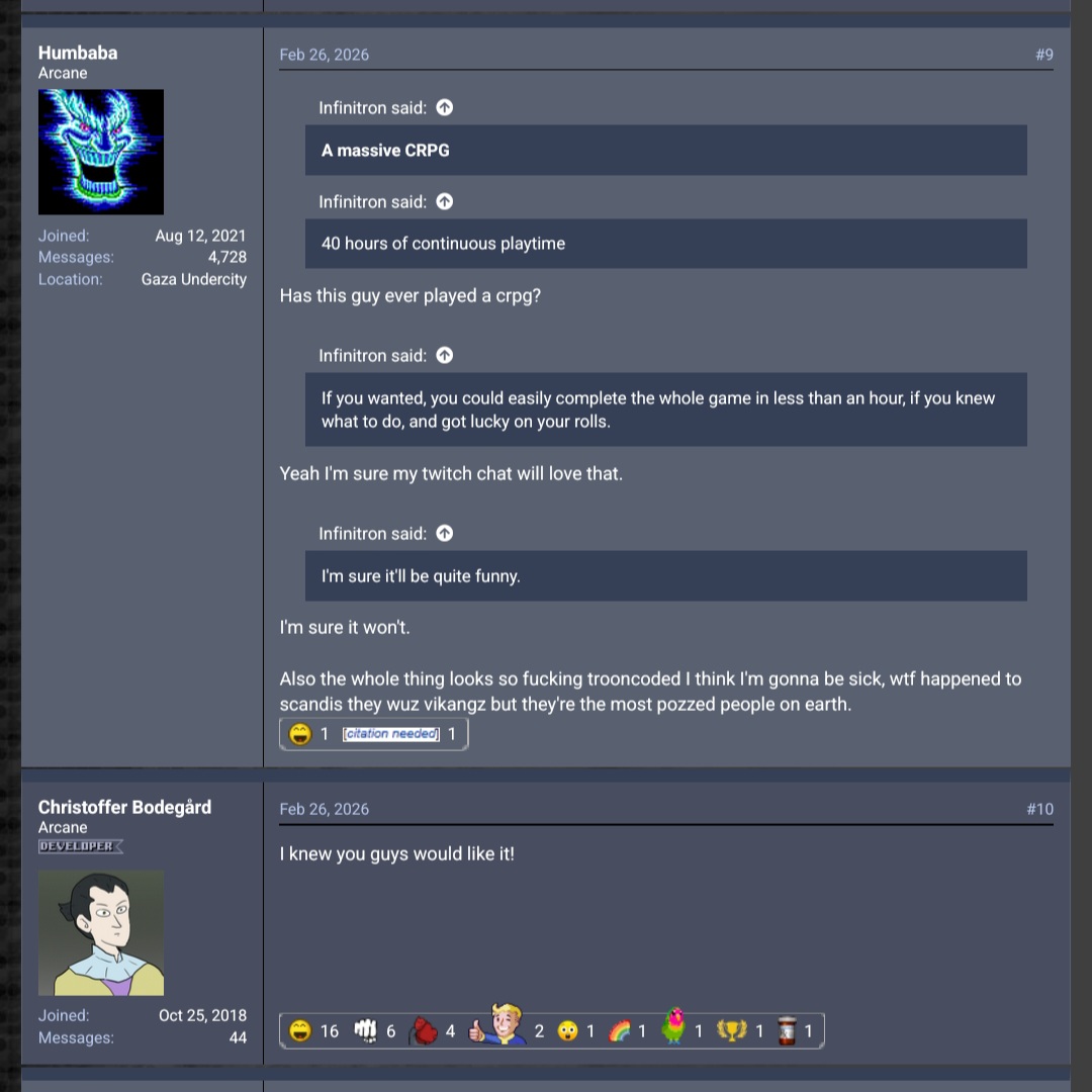 >>46240Biggest Disco Elysium guy on YouTube/Xitter seems to be very positive about it, which is surprising because he has otherwise been very critical of other "Disco-like" projects.