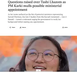 - Free Tibet Ties Threaten China Relations: Educated at a Tibetan Dharmashala in India, Lhazom’s rumored links to the Free Tibet movement raise alarms. “We can’t have a minister pushing Tibetan independence,” says Gen Z Karnali’s Supriya Shahi, stressing Nepal’s need for stable Beijing ties.