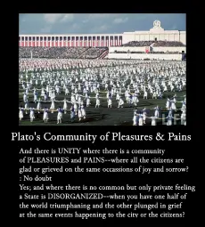 Plato's Republic Book 5>“Is not, then, the community of pleasure and pain the tie that binds, when, so far as may be, all the citizens rejoice and grieve alike at the same births and deaths?”