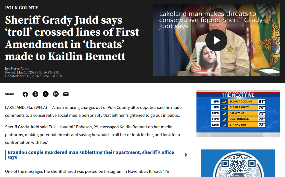 Sometime in November of 2025, not long after the Kirk assassination, our friend allegedly got into a conflict on Instagram with a right wing influencer, Kaitlin Bennet, when she visited their city. In this conflict he allegedly referenced Kirk's assassination and that was enough for her to take these as threats on her life and call the police on him and an investigation was conducted where they allegedly found evidence of plans to harass Bennet next time she visits their City.