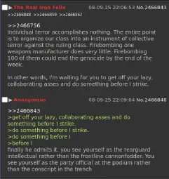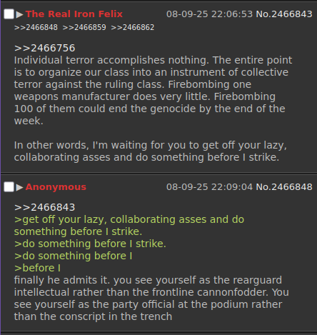 >>2574731>>2574733>>2574735Yeah I think it's worth reiterating that Felix's problem isn't that he's necessarily wrong about shit (he's correct at least half of the time when talking about theory) or that he's too militant (if anything we could use that energy). No, the biggest issue with him is that he's a fucking joyless douchebag who engages in purposefully over the top comparisons to justify his absolute black and white worldview and is more concerned with fantasizing about killing leftists he disagrees with slightly (despite what he may profess, he's actually not very dissimilar to most anarcho-communists) than actually going out and doing anything himself. He genuinely views himself as some kind of elite rearguard who's better than the rest of us because we've committed the sin of not blowing up the White House 20 years ago while the Iraq War was going on, so we have to atone by sacrificing ourselves so that he can walk atop a road of corpses leading to the castle in the air. He's also completely incapable of actually socializing like a normal pereson, and cant hear anyone talk about any form of popular culture or media without immediately having some kind of breakdown.