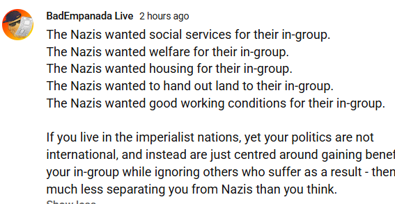now they have compatible left soccdem & pseudo-communist strasserite yappers who toe the line, and this is supposed to be proof that they're "not as bad as the nazis" yet.