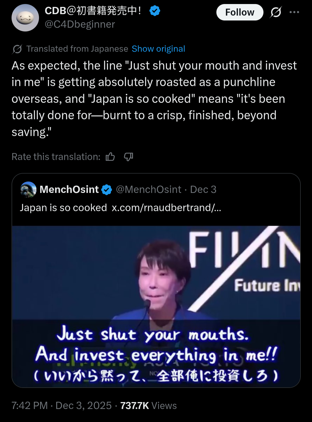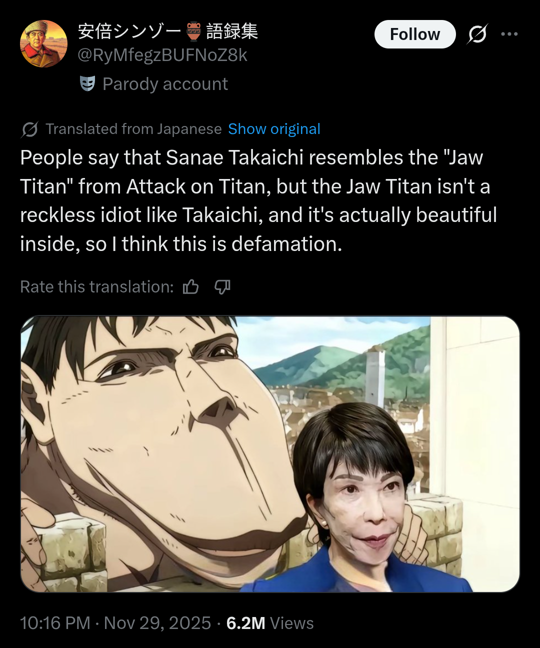 >>2581790Trump administration with Halo and Franklin, Milei with Chainsaw man and now this Japanese hag with Attack on Titan. Western, capitalist aligned governments are all subsuming into being controlled by retarded manchildren and womanchildren.