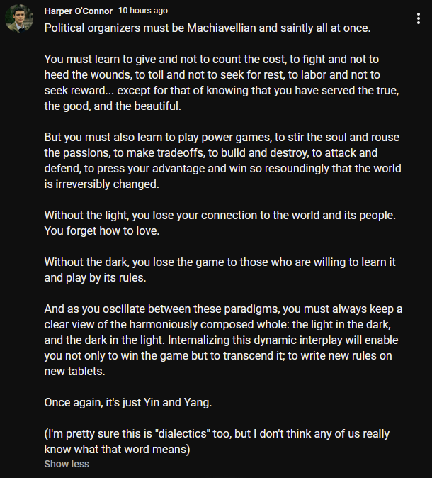 The left's culture is typically very sterile, academic and ultimately "uncool" and feels a lot like a puritan reading club, that's often marked by a fetishistic outlook on the "pure past" and not the creation of a new future. It often rejects pleasure, humor, aesthetics, and the messy "vibes" of actual human life in favor of correct-line asceticism. What does socialist fun look like? Socialist beauty? Socialist community? Socialist heroism? Socialist pleasure?