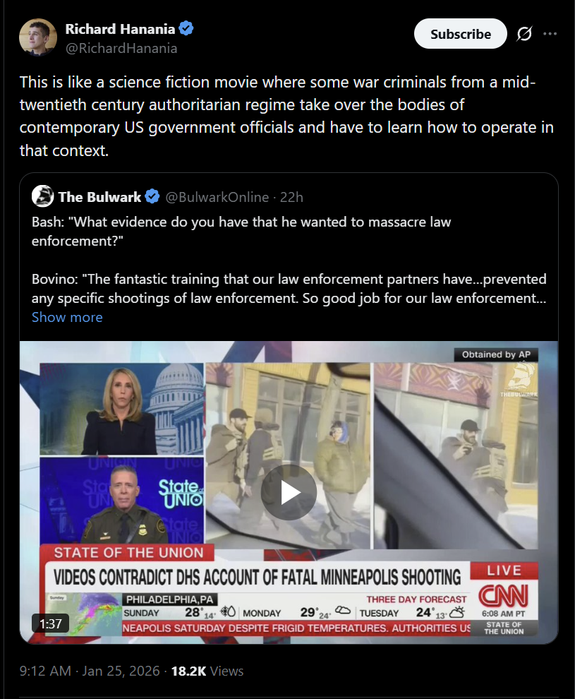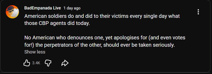 >>2665766He's moralising yeah. Well the way these feds behave is like the military in Iraq. They even dress like private military contractors. A lot of mid-ranking leadership of guys in these organizations in their 40s are ex-military millennials and Gen Xers who have carried that mentality with them. This shooting really shook normies because it makes the normies feel like the normies elsewhere in the world who were going on with their lives fine until the U.S. military showed up, even if they haven't connected the two yet. The White House's response has been a disaster because they're coming out with anti-gun talking points straight out of 90s-era gun control rhetoric.