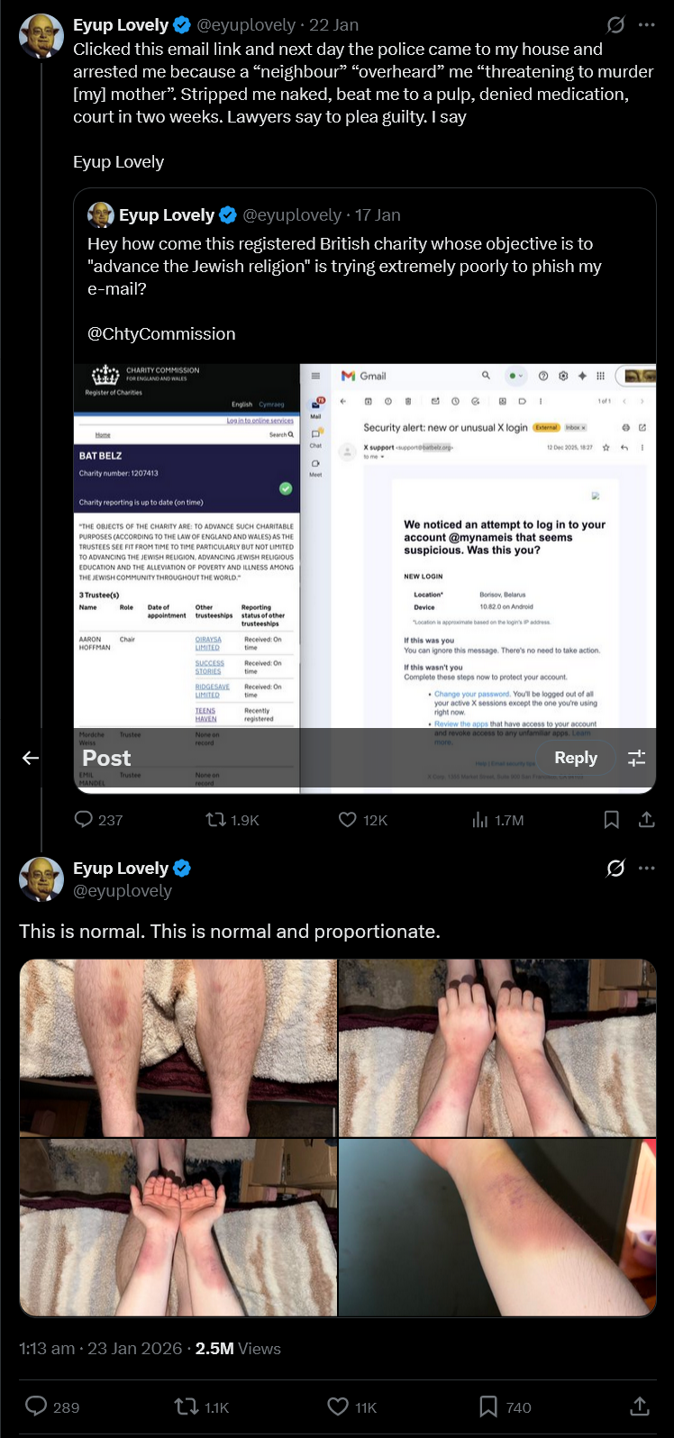 >>2666137Are we sure he's not trolling? Like 1% of his posts are genuine and the rest is taking the piss. He and his friends post shit along the lines of "Eyup Lovely has been killed/assaulted/OD'd" regularly, don't they?