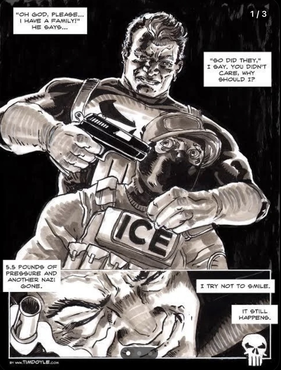 >>2666375I mean obviously, the fascist vigilante comic guy shooting another fascist vigilante? punisher fans love ICE. people only know there's a nazi marvel hero because off all the cops and nazis that wear that stupid skull logo.