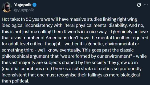 Tl;dr Yugopnik is doing the left wing equivalent of "black people do all the violent crimes in society". Just switch law and order with progressive sounding codewords like oppression or reactionary