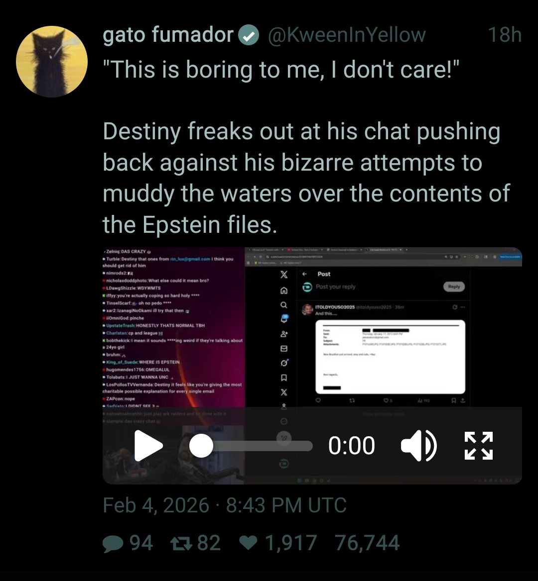 >>2681114It’s because Destiny works with the Israeli government and Epstein was one of Israel’s most important Mossad agents. Destiny has to talk about it because it would be weird if he didn’t but he can’t out Epstein too much because of the Zionist cock in his ass.