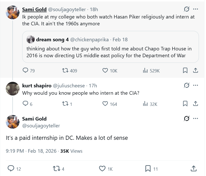 >>2697685>but sami gold (known liberal zionist and objectively an interloper for the left) is bragging that the CIA is more progressive and has overcome it's mccarthyite past>>2697726>It's not reconnaissance lol, it's just that leftist media and analysis is objectively better so even ghouls and glowies will use it.I met someone who worked for the National Geospatial-Intelligence Agency in D.C. once at a bar (that's one of the less impressive military intelligence ones), they're just around there, you run into them. "Oh what do you do?" They work for the State Department or whatever. Also saw the Russian military attache at another bar during happy hour, and "military attache" is almost definitely intelligence btw. They're just around D.C., it's part of the atmosphere.