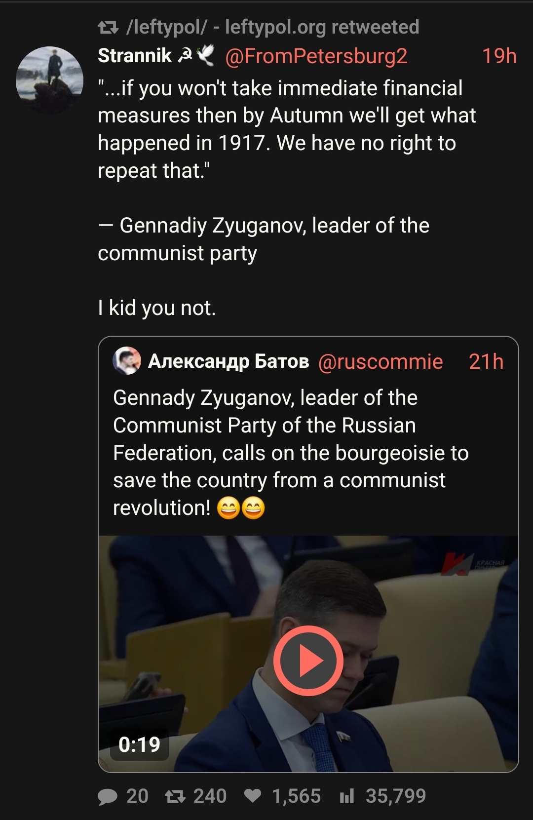 >>2789767Mamdani and the CPRF are cut from the same cloth tbqh. Both are in the orbit of their respective bourgeoisie, its just that the Russian ruling class is less reactionary by virtue of being a not being part of the imperial core.