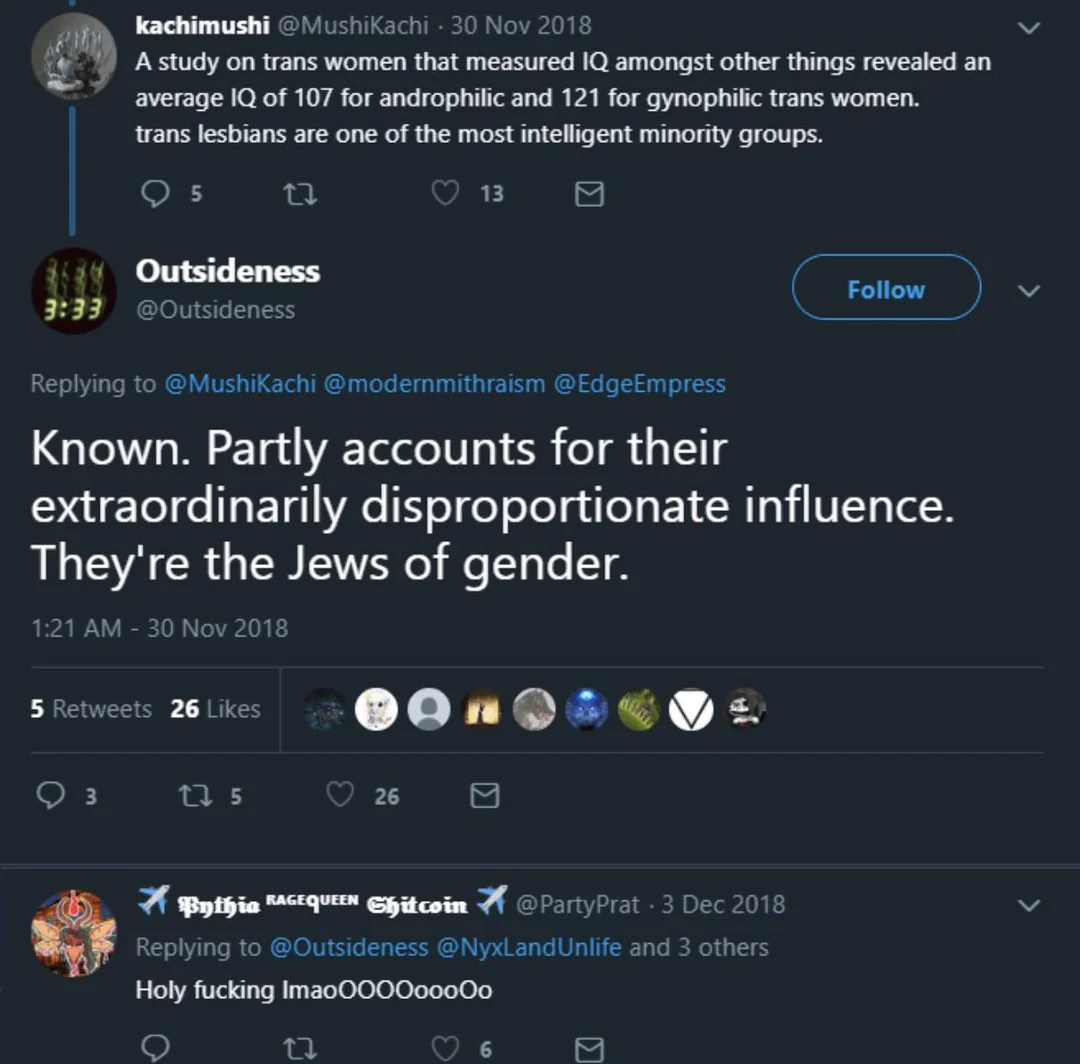 >>2789945there are exactly two groups of people on the face of the planet that have an interest in conflating the so-called jewish question with hostility to the state of israel in the way spencer does here, i.e. those who answer that jewish question with either zionism or eliminationism. it's no coincidence that posts here are constantly trying to frame it in those terms, only typically eliminationism is euphemized as 'anti-semitism', and it's also quite suspect that you implicitly cede this framing yourself by praising what spencer has to say here as "important".