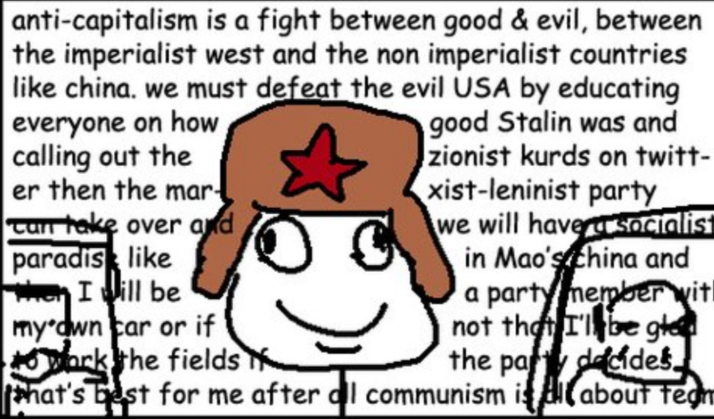 >>2783207Not sure what you're getting at, as I don't see obviously reactionary or counterrevolutionary content on your pic like claiming china isn't socialist or that russia is imperialist