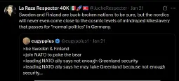 The more I think about Greenland the more I think trump should do it. It would fracture NATO, cause distrust among the liberal democratic vassal states, and maybe even give Europe a spine and stop boogeymanning Russia. Granted this may empower the far right. But at this point the left is so cucked I feel the only road to power is through a counter reactionary revolution