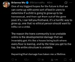 >>2789931>Gender theorists: sex is a social construct<Brianna Wu: we need genetic tests for transsexualityGiga brained shit, Wu