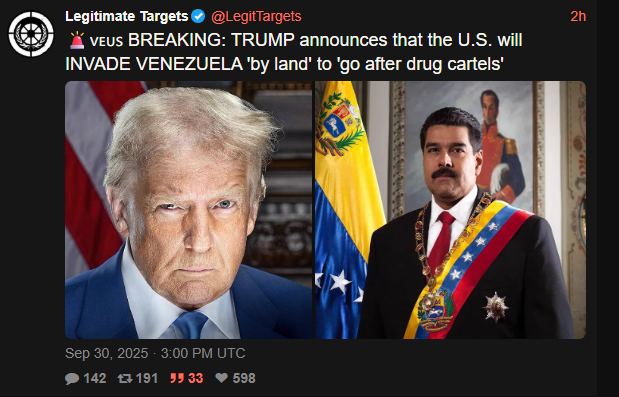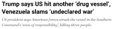 >Venezuela mobilizes its militia after US says it’s deploying military forces to waters around Latin America:https://edition.cnn.com/2025/08/19/americas/venezuela-maduro-militia-us-military-deployment-intl-latam>US destroyers head toward waters off Venezuela as Trump aims to pressure drug cartels:https://apnews.com/article/trump-venezuela-destroyers-maduro-drug-cartels-e33794ebc24d9031e536d132ce205b4c>Donald Trump Deploys 3 Missile Destroyers: What to Know:https://www.newsweek.com/donald-trump-missile-destroyers-venezuela-drug-cartels-2115786>Proposed United States invasion of Venezuela:https://en.wikipedia.org/wiki/Proposed_United_States_invasion_of_Venezuela>Estados Unidos, “dispuesto a usar todo su poder” contra el narcotráfico desde Venezuela:https://elpais.com/us/2025-08-19/estados-unidos-dispuesto-a-usar-todo-su-poder-contra-el-narcotrafico-desde-venezuela.htmlI don't know if you've heard the news, but several US ships have sailed towards Venezuela's coast in order to "combat drug trafficking". Someone investigate the ships to see if they're old to see if they gonna false-flag Venezuela. I know that Nothing Ever Happens, but Trump has already put a price to Maduro's head and these news… I think something's cooking, something's sizzling.