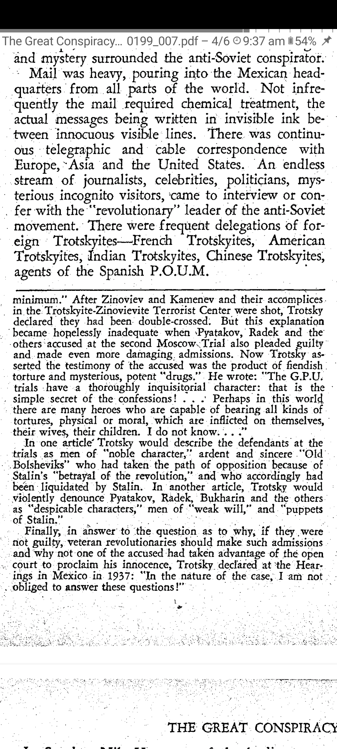 >Involved here is the testimony of Pyatakov. He stated that he met me in Norway in December 1935 for conspiratorial talks. Pyatakov was supposed to have come from Berlin to Oslo by airplane. The immense importance of this testimony is self-evident. I have declared more than once, and I declare again, that Pyatakov, like Radek, for the past nine years was not my friend but one of my bitterest and most treacherous enemies, and that there could have been no question of negotiations and meetings between us. If it were proven that Pyatakov actually visited me, my position would be hopelessly compromised. On the contrary, if I prove that the account of the visit is false from beginning to end, it is the system of “voluntary confessions” which will be compromised. Even if one were to admit that the Moscow court is above suspicion, the accused Pyatakov would still remain suspect. His testimony must be verified. That is not difficult. Pyatakov is not yet shot. He should immediately be presented with the following series of precise questions.Why did Trotsky throw his confidants under the bus so strongly, lol? I thought they were real, true old bolshevik revolutionaries who were wrongly accused at Moscow Trials!