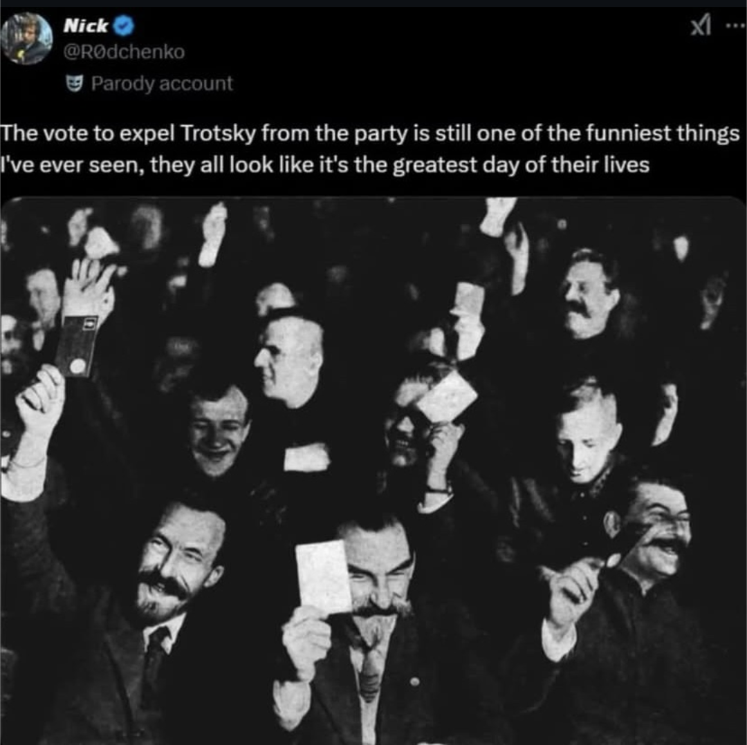 I think he was alright for a while then turned into an irritant figure. He joined the bolsheviks a month before the October revolution, defended Petrograd against Kerensky and was put in charge of the peace treaty with Germany, which he fucked up and resigned. Then he was put in charge of creating and administrating the Red Army, helping win the civil war, however he came out of it debilitated and lost power to a troika of Stalin-Kamenev-Zinoviev. Then the CPSU overwhelmingly voted for Stalin and Trotsky attempted one last time to stand up against the party but only pissed them off more. He was removed, exiled and finally banished from the USSR. He spent the rest of his years criticizing Stalin while maintaining that the USSR was a workers state, something trots eventually rejected. He was accused and tried in absence for taking part in a clandestine plot to get rid of Stalin, something trots denied for several decades until his personal archive confirmed its existence. Then he got assassinated. And that's the story of Trotsky. So I guess his real legacy should be helping win the Russian civil war and not modern trot movements. And I'd say War communism was unironically the closest the soviets got to communism. Trotsky wanted to take that and turn it into militarized labor, which would've made a really extreme experiment, a sort of Soviet Prussia. No idea if it would have lasted but admittedly part of me has always admired some of these hyperleft ideas such as war communism, militarization of labor, the cultural revolution, the Khmer economic experiment