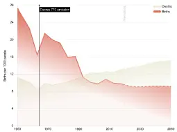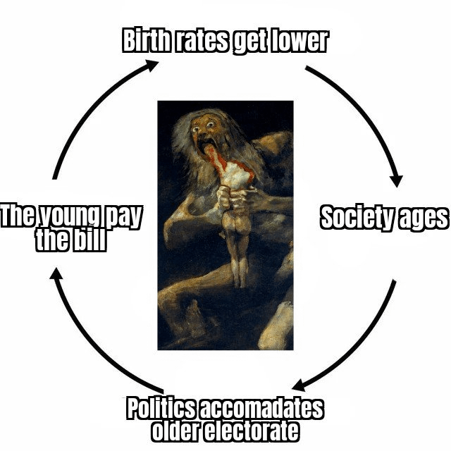 >declining birthrates lead to shrinking economic growth and tax revenue+larger proportion of dependents, all due to a shrinking labor force