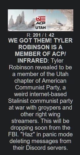 >I honestly hope somebody takes over the acp from haz, someone that actually has charisma and intelligenceAgreed, I mean, Haz runs a party called the American communist party… that he represents himself with a Russian flag lmao.