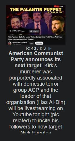 I think the ACP is completely irrelevant (even more so then most already irrelevant communist parties in the states), but what is even the appeal? I seriously want to know what any ACP defender sees in them, on either a practical or theoretical front, that is worth any modicum of merit and isn't dwarfed by some already existent orginazation or movement. On a practical standpoint, his attempt to appeal to conservatives is entirely dead in the water; not a single one is going to jump ship to his particular brand of "communism" in any way given the dozens of other political alternatives that don't require them to be the one thing they, at the very core, are vehemently against. Liberals aren't going to be convinced either for obvious reasons as well. The various "factions" of the far right aren't going to be signing up and paying dues anytime soon either, they have their own groups, individuals, and programs to rally around that don't require them to literally join up with the thing their ideology (9/10 times) emerged to oppose. That leaves open only a portion of the disaffected that is "left leaning" in one way or another, in that they are willing to hear out some discussion on Marxism or whatnot without immediately brushing it off. Of those, 99.99% of those individuals aren't going to want to follow, in real life, some person who's claim to politics is being an inept terminally online streamer who doesn't even understand what he's saying half the time. And no, throwing out buzzwords like "subject" and "manifest" like some liberal college dropout who heard "Lacan" one time isn't going to convince people when they try and actually get to the meat of your program. Of the few that stick it out, you lose at least half to statements like "communism is patriarchal and that patriarchy gives more freedom to woman" or that "service workers aren't proles". Of the half that remain, you then lose those that are only radical in terms of economic program (if you didn't already lose them from the before mentioned comments), because your program is effectively mild social democracy with a mix of American exceptionalism/nostalgia, then those who care zero for "American patriotism" because they see the US as an inherently imperial colonialist project and find your incessant need to appeal to it as reactionary. Older leftists are also out, because they aren't going to get practically any of what you are saying or how you present it, as are the MLs who adhere to the anti-theist internal party policy of nearly every ML party in existence. So all you are left with are a small percent of terminally online, contrarian, pro-US (in the context of "return"), pro-religion, anti-social, largely unemployed, middle class, disaffected young men. Which can be loud, but in the end, cannot contstruct a party that operates in the places they need to, or have either the theory and/or the praxis needed to prevent being superceded by literally anything else. Even a failure of a party like the CPUSA has broader appeal in certain neighborhoods, and aren't going to scare away minority workers when they learn how chummy their leader is with retards like Fuentes after a single google search.