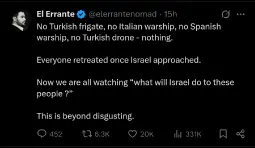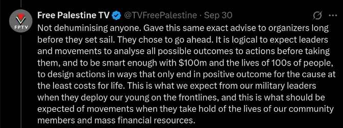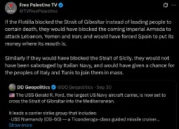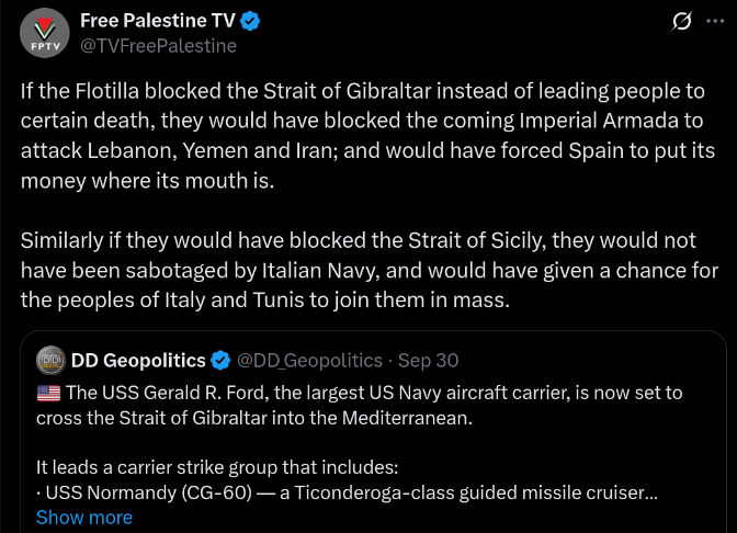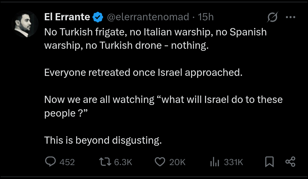 Either way, this is akin to petitioning the genociders to take pity. The lot of them praising the flotilla today, bent the knee and kissed the ring and glazed Trump's plan for Gaza YESTERDAY. You can have all the PR you want, but it ain't gonna change a thing. At best, you'll get the liberal Zionist version of victory to celebrate. Which will no doubt content much of the EU, by providing absolution.