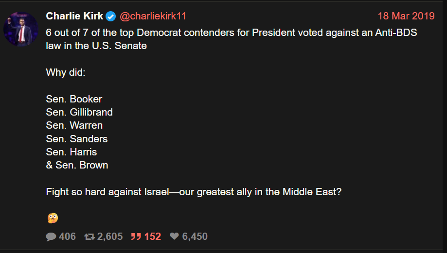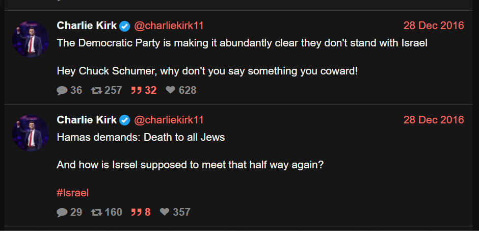 >>2472180Kirk was a huge Israel stan. Netanyahu expressed concern about youth support in America, so there's an angle where this is some elaborate psychological ploy, but eh…