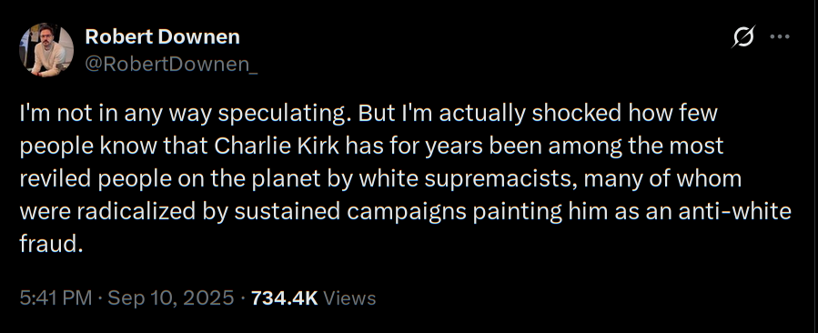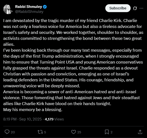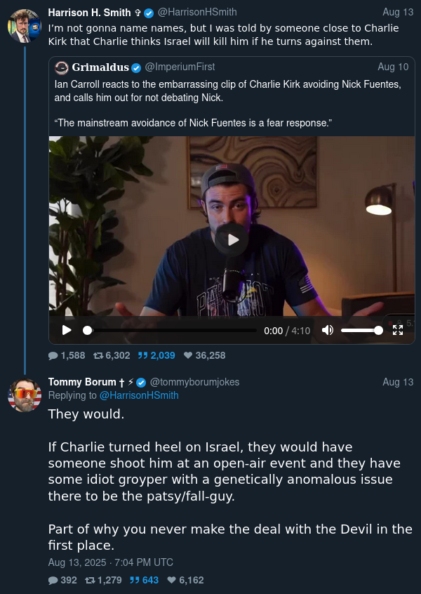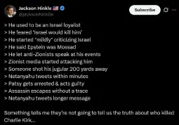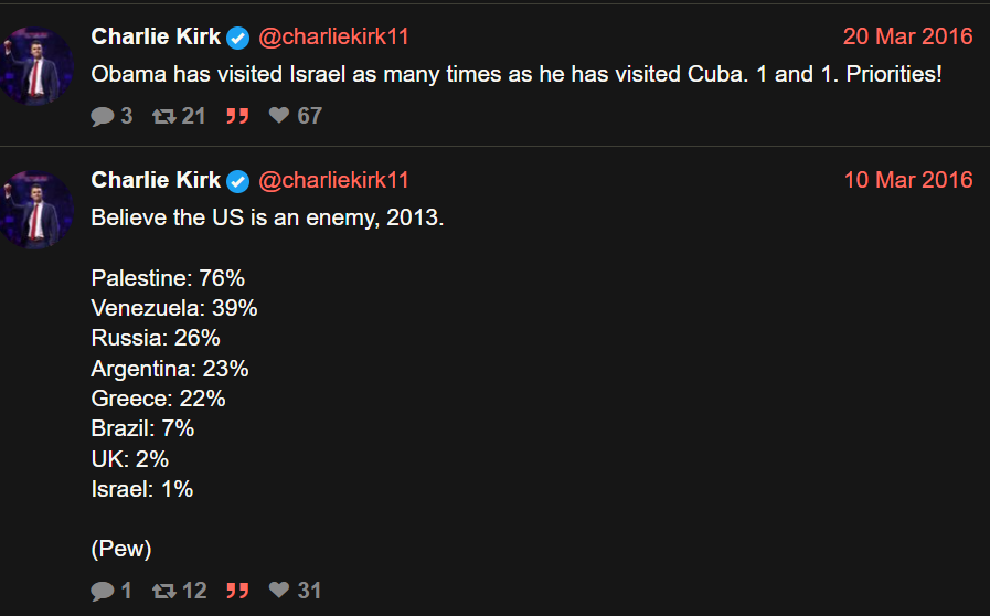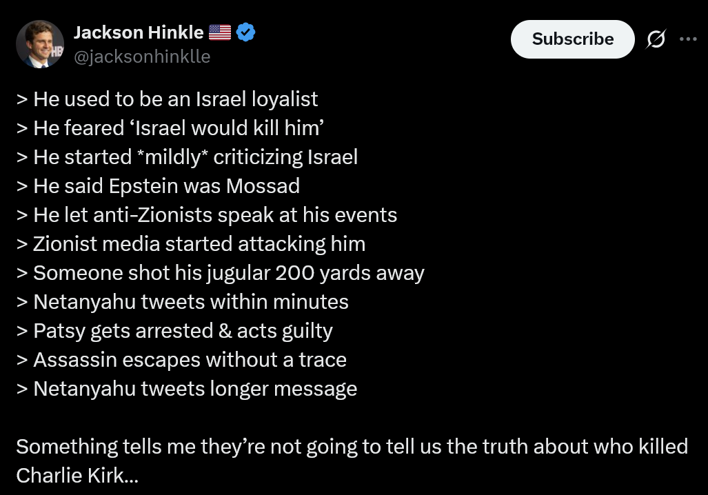 As much as I don't like Israel, I don't think Charlie Kirk said or did anything that Mossad would assassinate him for.