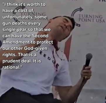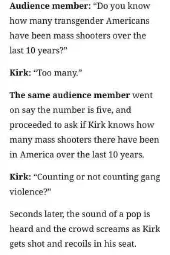 <Do you know how many mass shootings there have been this year?<Kirk: Not counting gang violence?<*bang*Also this was above his head lol