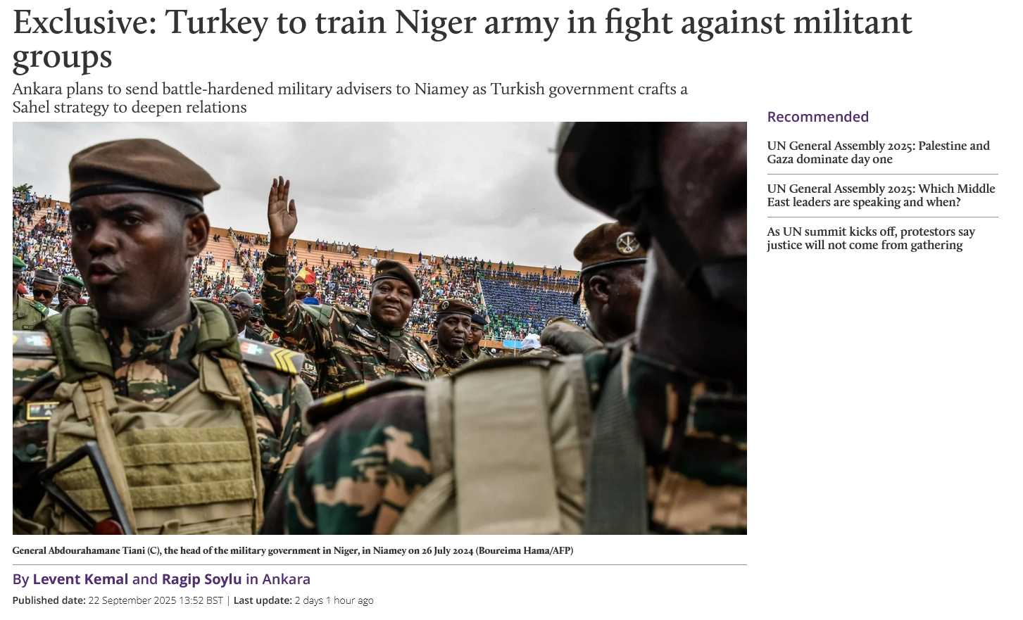 https://www.middleeasteye.net/news/turkey-train-niger-army-fight-militant-groupsIs Niger cutting ties with Russia after just forming them? Maybe after realising that Russia is so tied up in Ukraine they aren't able to send troops or other support? Or are they playing both sides? If that's true, I wonder what overlap there is with Turkish and Russian foreign policy in the Sahel given their opposition in other conflicts including Ukraine, Syria, and Libya