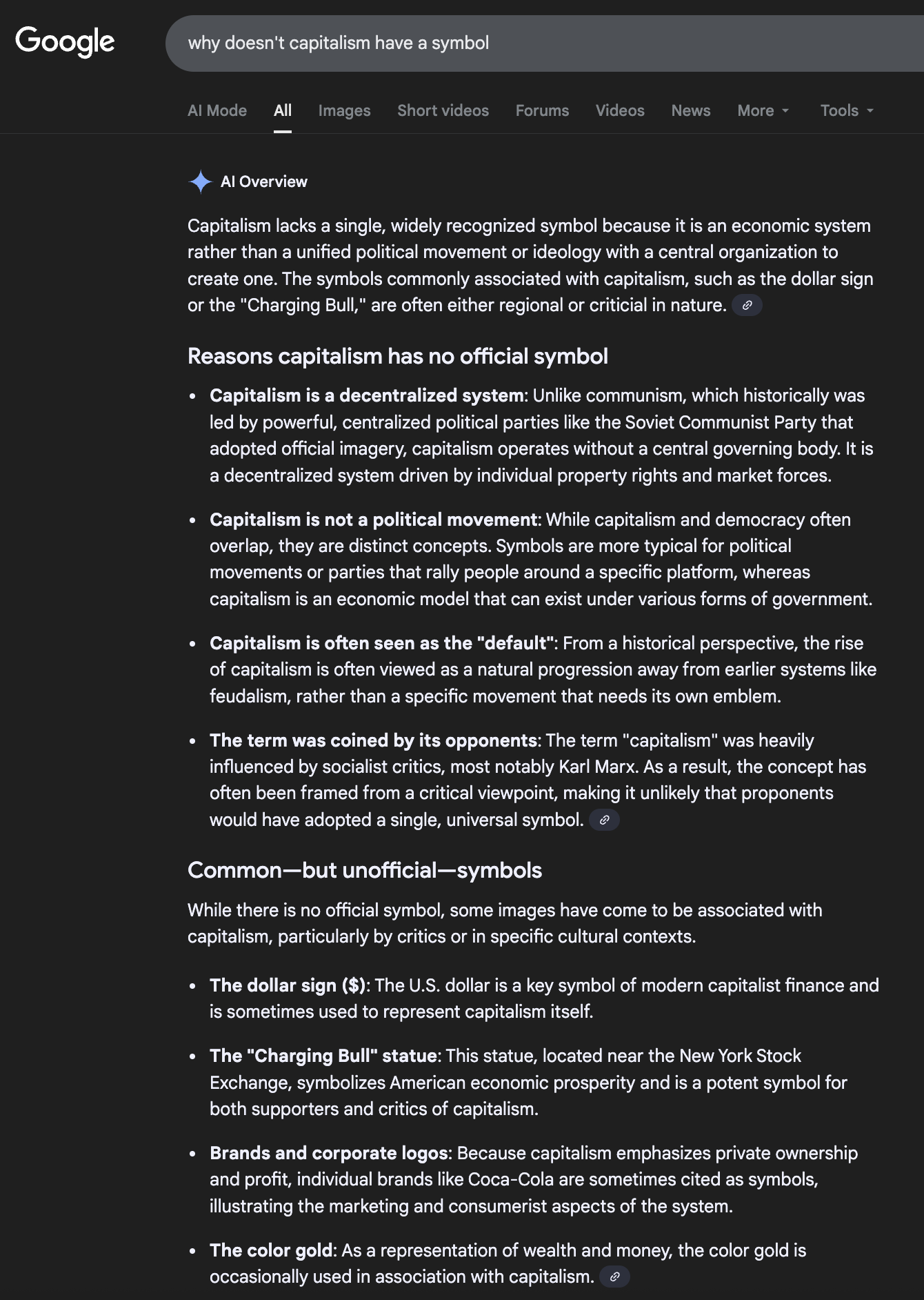 >>2492578>What you guys think the capitalism symbol should be?capitalism isn't an ideology. it's a societal structure, based on a mode of production. It's like asking slavery to have a symbol.