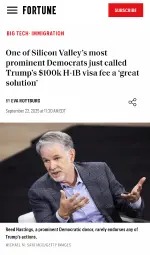 https://fortune.com/2025/09/22/reed-hastings-democratic-megadonor-supports-trump-h1b-visa-policy/One of Silicon Valley’s most prominent Democrats just called Trump’s $100k H-1B visa fee a ‘great solution’