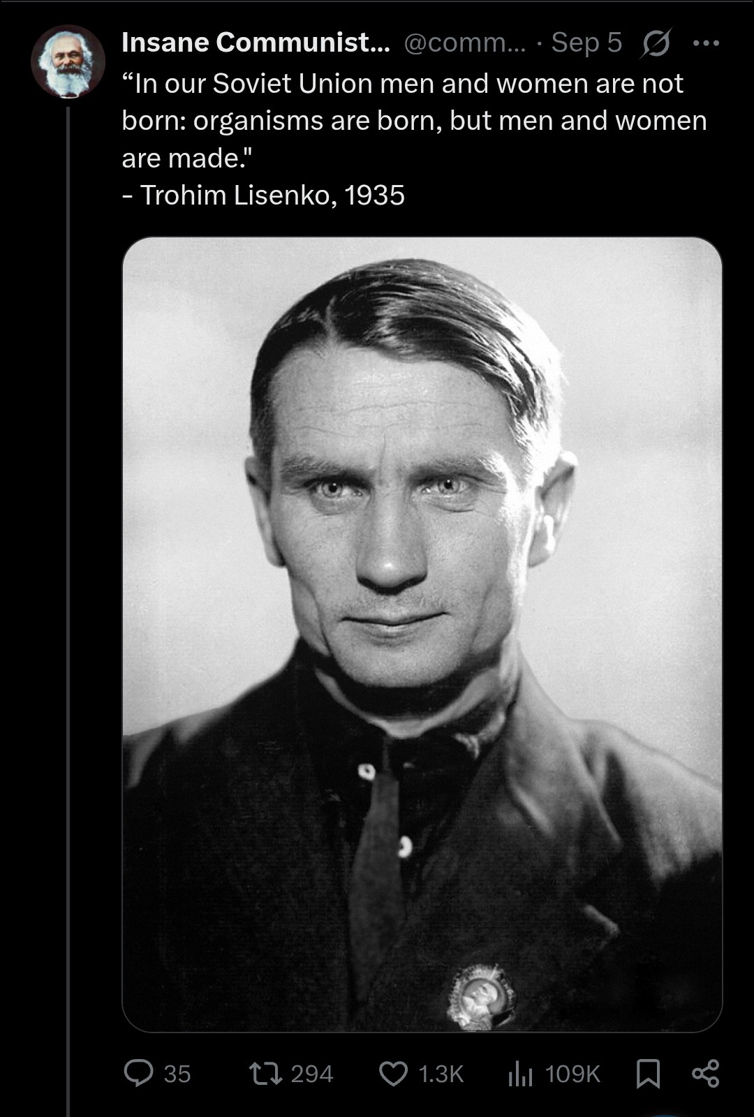 No man has been slandered so much in the history of science. The class enemy and their pseudo-intellectuals pour mud and shit on the man who dared to call a spade a spade - that biology is on firm Marxist-Leninist principles. That we did not create Marxism-Leninism, but that it is Marxism-Leninism that created us. Dialetical materialist understanding of the flora and fauna was forged with Great Darwin’s evolution theory. It was sharpened into a fine blade Engels’ brilliant ‘Part played by labour in the transition from ape to man’. Comrade Lysenko gallantly wielded the Immortal Science and embarked on steppe-wide crusade against scarcity amd famine. And the treat lovers hated him for it, they still do. No, no, no! No abundance of wheat, rice, and corn for the asiatic hordes and the African specimen! How dare they! Funko Pops for me, Famine Poop for thee! By burying Lysenko , and promoting Monsanto debauchery in the fields, by bullying Bohm-deBroglie and promoting the Heisenberg-Bohr mystic mafia in reactors, the Treatlerites secured the Century for themselves. But we must not be afraid. We must uphold the Great Men of Science. As Neruda’s pen truthfully carved: To be Man - that is the Stalinist Law !