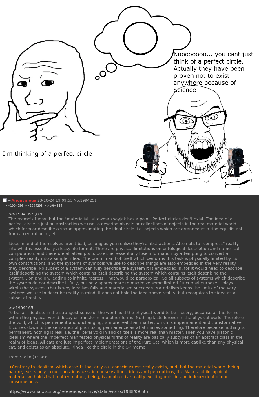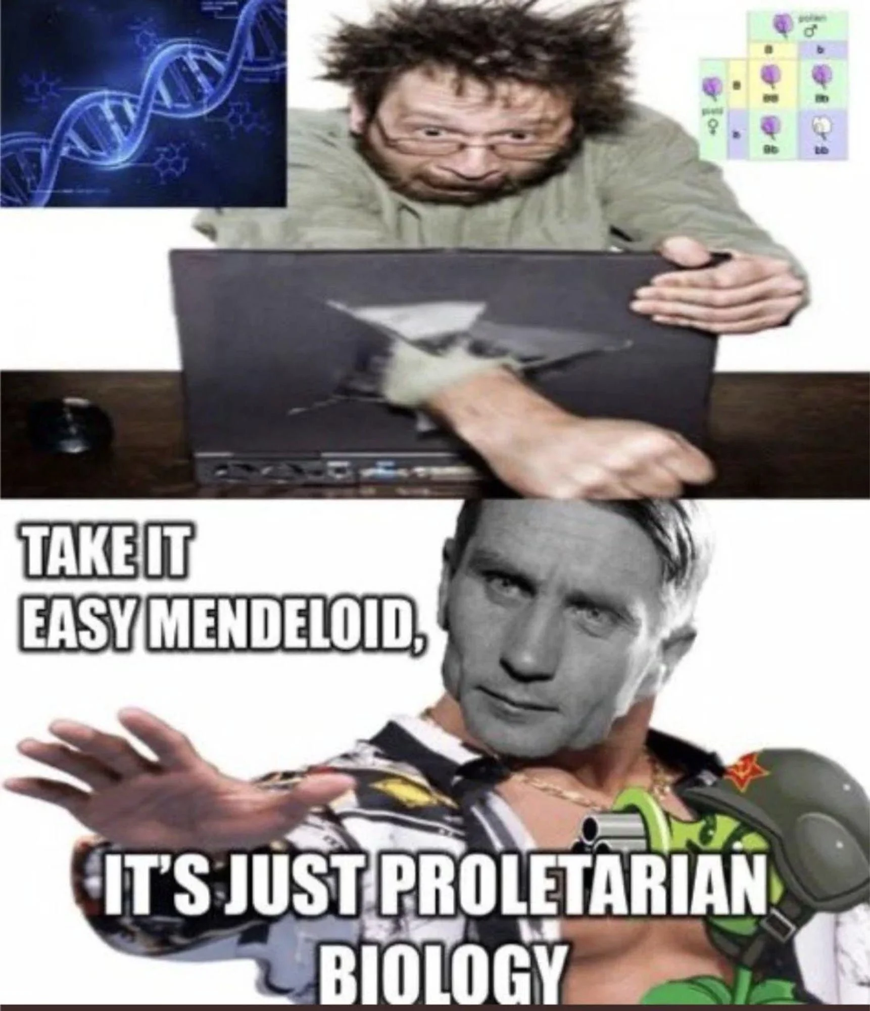 Lysenkoists ironically claim to be dialectical materialist (i.e. grounded in material reality, as theory must be tested through practice), anti-idealist, anti-dogmatic defenders of science that serve the working class. They critique others for being ideological, metaphysical, or idealist. But when faced with material facts (modern genetics works, Lysenkoism fails), real-world historical outcomes, actual Marxist practice (China using genetics, not Lysenkoism), and reasoned counterarguments, they dismiss it not based on substance, but because they have tricked themselves into thinking that modern genetics is always and forever "eugenicist" and "scientific racist." That’s pure idealism! They’re retreating into ideological purity tests rather than confronting contradictions. It’s the exact opposite of what dialectical materialism demands. They should at least try to reproduce Lysenko's experiments, but in a less secretive way, and with peer review from the international community, including Marxist scientists from countries like China, Laos, Cambodia, Vietnam, and the DPRK.