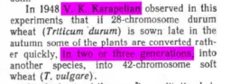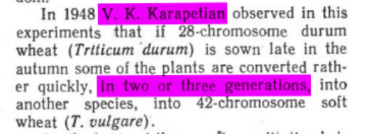 <in 1948 V. I. Karapetian observed in his experiments that if 28-chromosome durum wheat (Triticum durum) is sown late in the autumn some of the plants are converted rather quickly, in two or three generations, into another species, into 42-chromosome soft wheat (T. vulgare). https://www.marxists.org/reference/archive/lysenko/works/1950s/new.htm