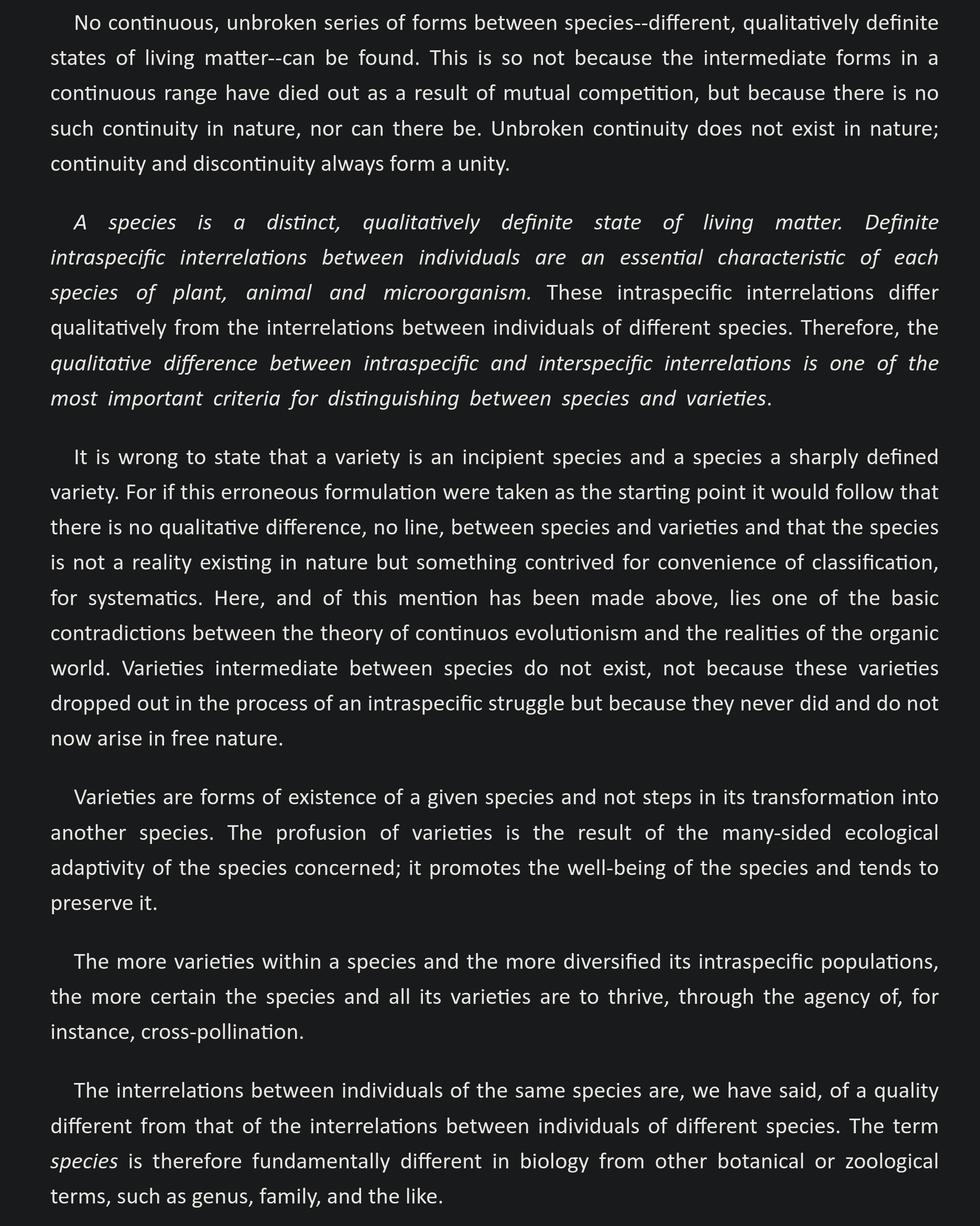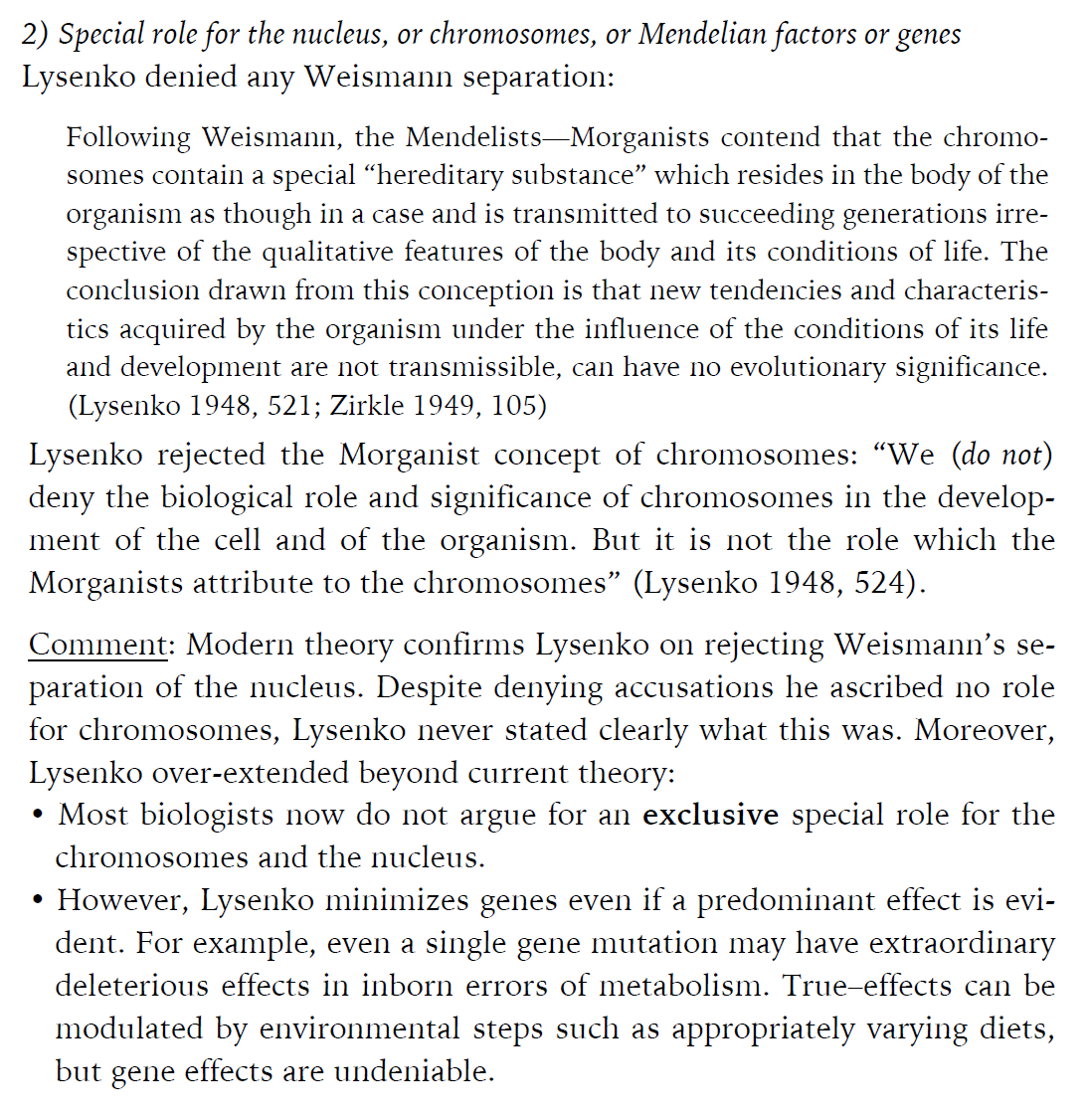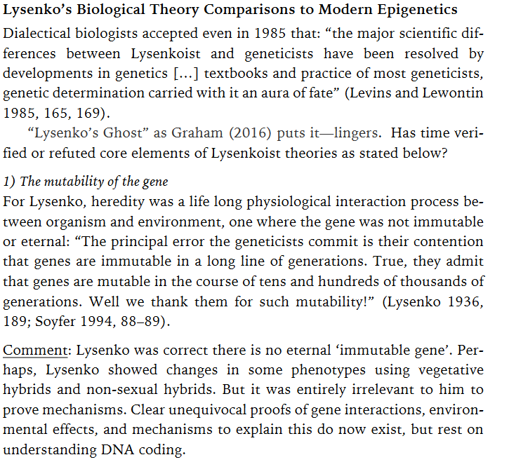 FWIW Lysenko never criticized eugenics in that way, since the Soviet Union had its version of eugenics / selective breeding for social purposes. His dispute with the geneticists was over the scientific claims made about life and evolution, rather than a moral or political claim; and Lysenko didn't deny the existence of "genes" as such, which is why he brings up the chromosomes. He is specifically arguing that heredity did not work in the way that was being asserted by the eugenists, where "genes as information" exists in some physical code that can be read and rewritten at will. The actual working of any living body does not allow this to trivially edit life in the way geneticists please. All that can be done with this, and this is very imperfect, is chemical changes; changes which are rarely ever consistent, and the only thing the geneticists do is snip out some genes for another and guess that this will have some effect by feels. It's like copying a piece of computer code blindly and thinking "this always works" and insisting you're not supposed to think about what anything you copied does. No computer programmer would think like that if he were serious. It would be a dereliction of the most basic things a programmer does.