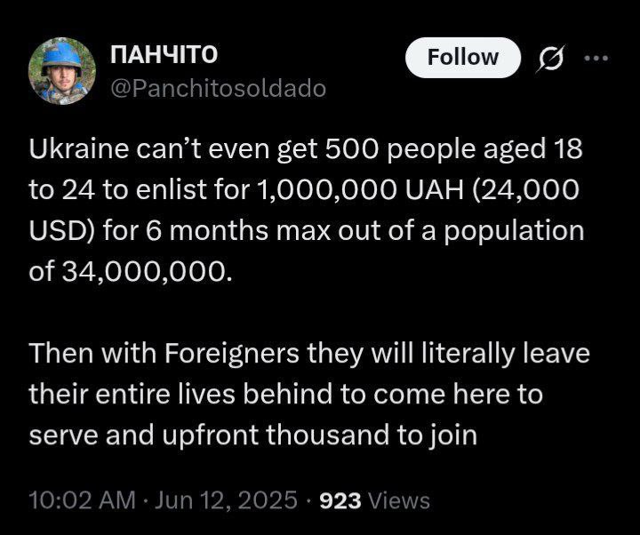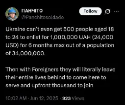 >Ukrainian propagandaRussian recruitment numbers corroborate the AFU's numbers. Either the Russian army is overflowing with men sat about sniffing their own farts or they died and units need replenishing with fresh soldiers.