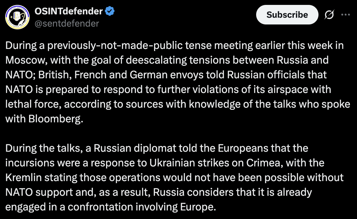 Hilariously, since the EU's place at this time is to surpass the 5% of GDP tribute, but they can't admit to any of the ways in which the conflict is fought, much less the actual frontlines, they concoct a new fable about Russia hacking their planes and "infringing on their airspace" and souring their cow's milk every other day. While buying increasing amounts of proxy Russian oil and building up Azerbaijan to be an even better hidrocarbon laundromat. And presumably selling half of Armenia to the USA so they can build a big ass military base in front of Iran.