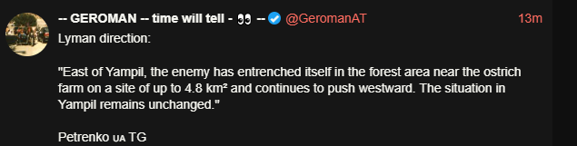 Either way, Russian progress isn't really measured in sq km, but in dead Ukrainians. There is no other way for Russia to get de-NATOization without Kyiv losing so much of its fighting age population that it doesn't want to fight anymore.