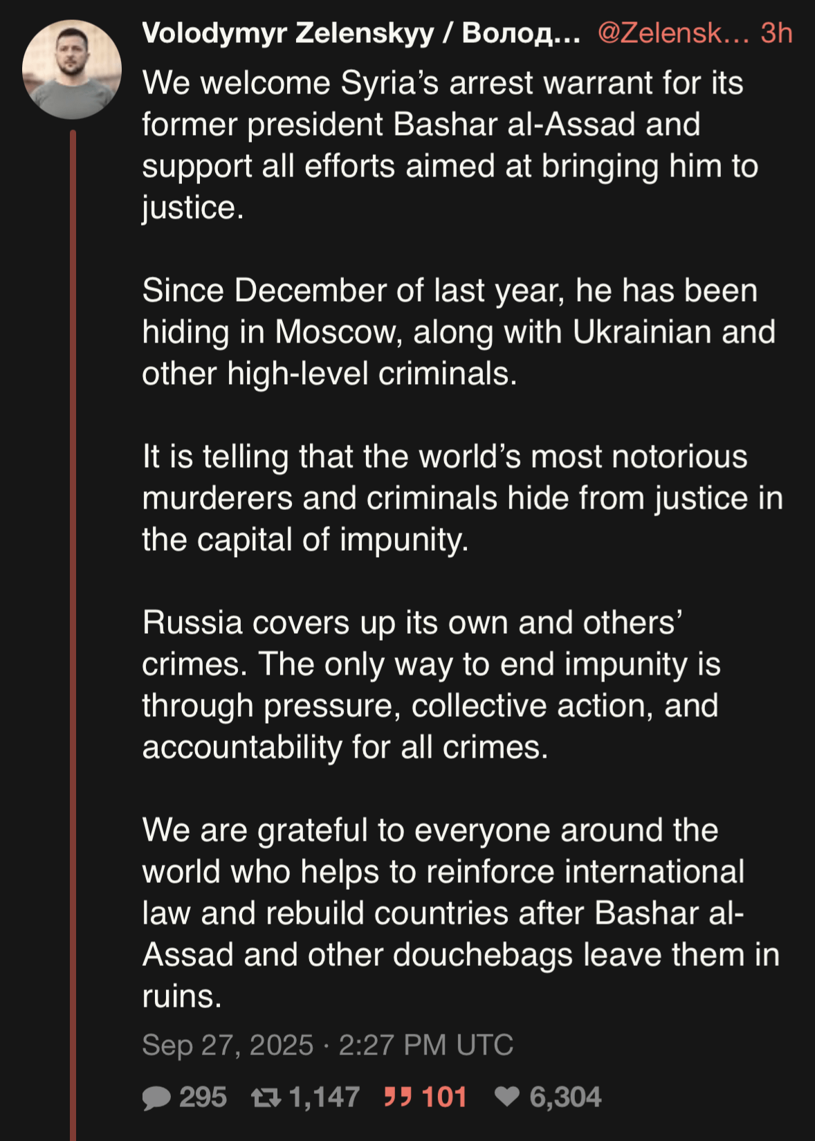 Why not go with something more truthful, like how Zelensky is willing to fight this war across classes (targeting the Russian elites and leaders, weapons permitting), whereas Russia is trying to keep it a prole war?