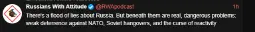 >the point is that Russians aren't going to be deterred for the reason Americans were in being killed by "goat farmers"Why? Do you have any reason to think that Russians don't grieve and mourn their dead? A million Russians can die and no-one sheds a tear? Again, all these war dead to an army that was supposed to shatter and never fight back against their liberators. All while the RF is propped up and heavily subsidised by the world's strongest economy in China.