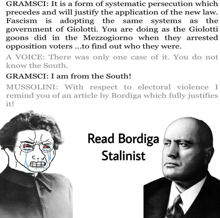 100 years later the fake """communists""" and /r/ultraleft memers are still talking about Bordiga and seething about him. Even actual "leftcoms" (not the online /r/ultraleft meme brigade who only learn about him from memes) dont give this much of a shit about him. All "Bordigist" texts are just the collective work of a party that merely maintained the original communist program and original Marxist theory.