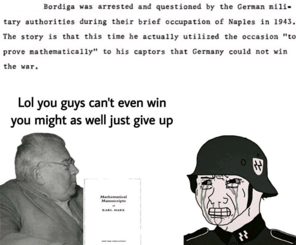 So in order to elevate this discussion, I suggest both the fake "communists" (MLs, anarchos, Dengs etc) and the /r/ultraleft meme brigade to stop talking about Bordiga and simply discuss the actual content of the communist program.