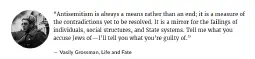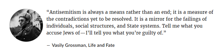 >Antisemitism can take many forms—from a mocking contemptuous ill-will to murderous pogroms. Antisemitism can be met with in the market and in the Presidium of the Academy of Sciences, in the soul of an old man and in the games children play in the yard. Antisemitism has been as strong in the age of atomic reactors and computers as in the age of oil-lamps, sailing boats, and spinning wheels. Antisemitism is always a means rather than an end; it is a measure of the contradictions yet to be resolved. It is a mirror for the failings of individuals, social structures, and State systems. Tell me what you accuse Jews of—I’ll tell you what you’re guilty of.