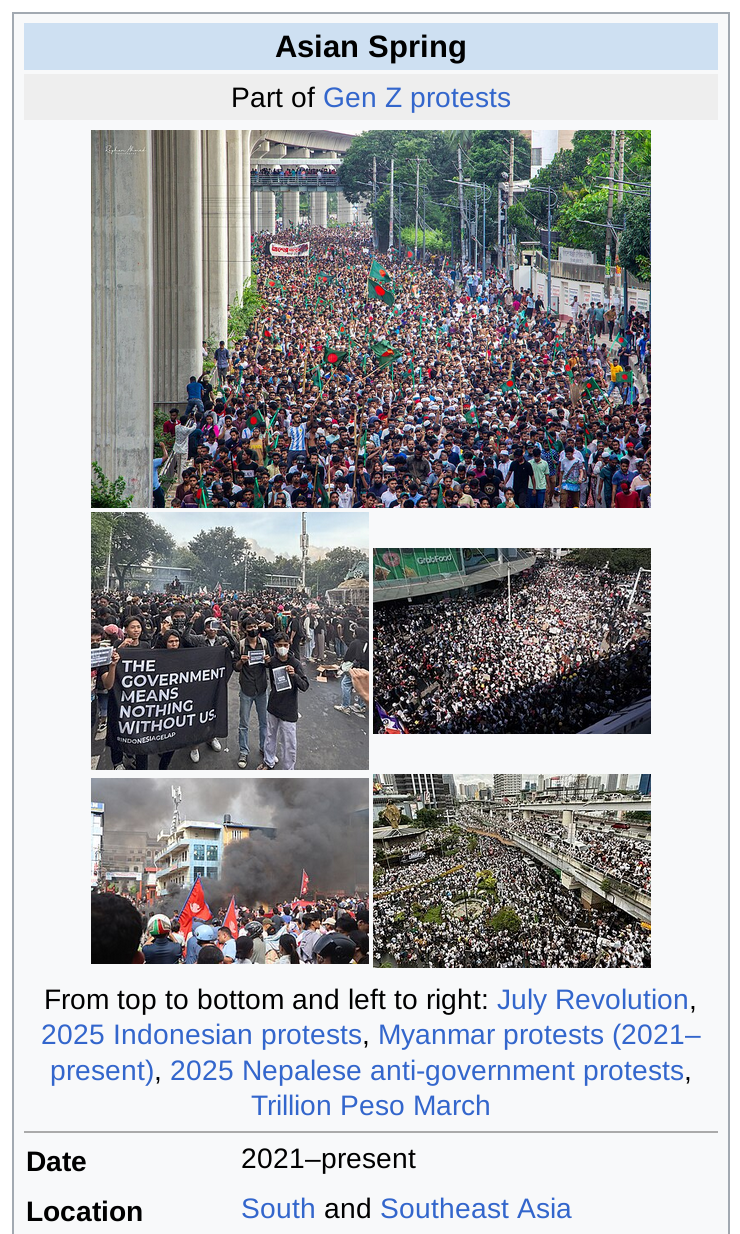 >>2504210>>2504269>>2504282>>2504153>Leftypol scholars, what do you think? Lumpen-rioting, based proletarian revolution, or CIA-colour revolution?https://en.wikipedia.org/wiki/Asian_Spring>Since the early 2020s, a series of mostly youth-led anti-government protests and uprisings have spread across South and Southeast Asia, with several leading to massive reforms and regime change. These protests began as a response to widespread corruption, nepotism, economic inequality and mismanagement, authoritarianism, and democratic backsliding.[1][2] The term "Asian Spring" has been unofficially coined to describe these events, citing their similarities to the Arab Spring, though "Asian Uprising", "Gen-Z protests", and "Gen-Z revolutions" have also been used. The protests started with the Sri Lankan Uprising, the popular "Aragalaya", then spread to other Asian countries including Bangladesh, Nepal, Indonesia, Philippines and Timor-Leste.[3][4][5][6][7]