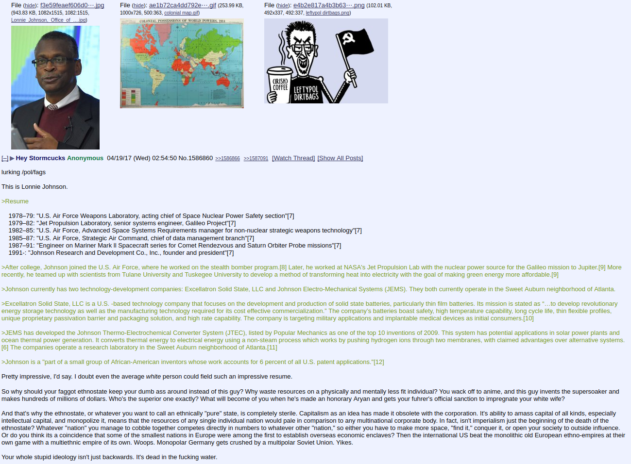 The point being, what White Nationalists or Supremacists fail to understand is just how attached ethnic minorities are to their home. They've got these long-running narratives of "blood and soil" but they act like you can just dump a random Black American in Africa and its "basically the same thing". Ditto for Israelis thinking Palestinians can just "go anywhere" or live with "other arabs" because they see no distinction between a Palestinian and an Egyptian or Jordanian or Moroccan; I mean for fuck's sake there's distinctions between ethnic minorities born in different states! A Tejano has some distinct differences from a Hispanic man raised in California or New York.