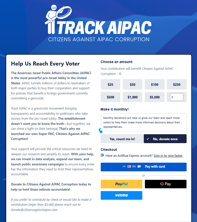 >>2505796>Track Zionazis>https://www.trackaipac.com/As far as I can tell track aipac is zionist affiliated. On their website they accept donations through act blue, a democrat party fundraising service.