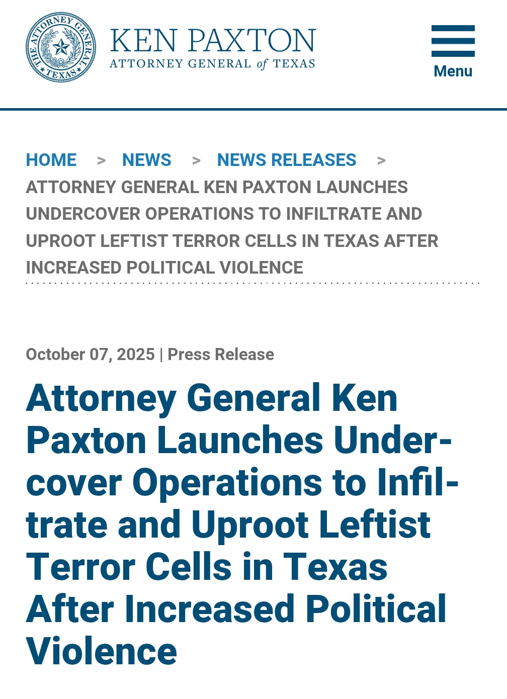 >Attorney General Ken Paxton Announces Undercover Operations Targeting Suspected Extremist Groups in Texas Following Rise in Political Violence